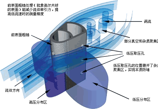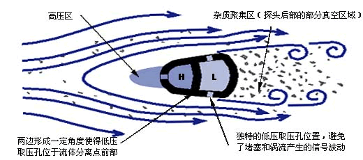 探頭的前部形成高壓區(qū),壓力略高于管道靜壓,阻止了顆粒進(jìn)入。請注意:在探頭的高壓取壓孔處流體的速度是零,沒有物體會進(jìn)入取壓孔。